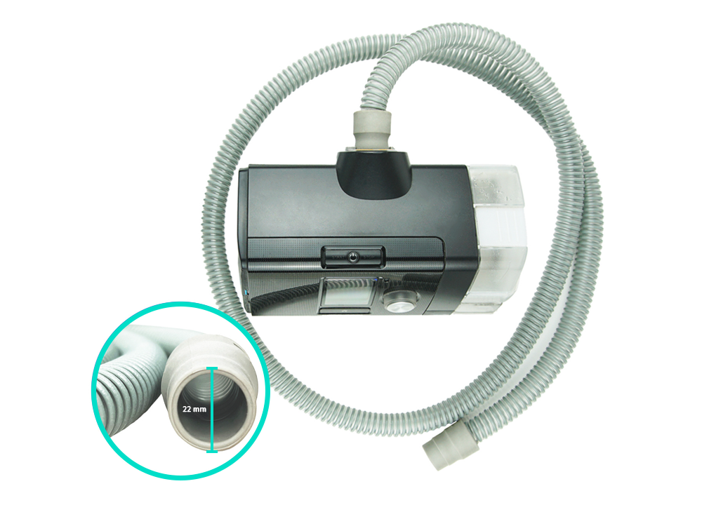 - Flexible standard CPAP hose with 22-mm sleeve and an internal diameter of 19 mm